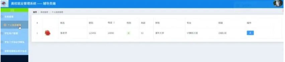 辅导员点击系统管理;在个人信息管理页面对姓名、密码、电话、性别、学院、专业、班级等信息进行查看或修改;