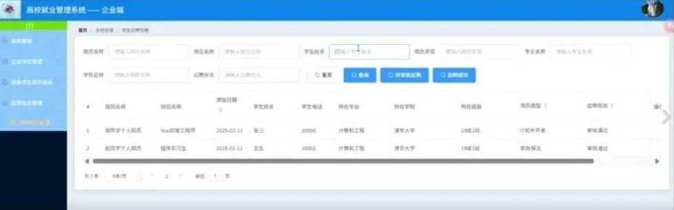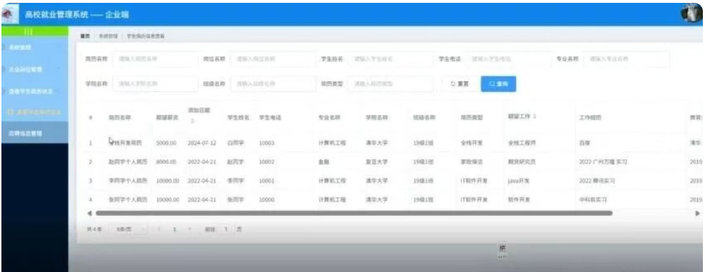 企业点击学生应聘信息;在学生应聘信息页面对简历名称、岗位名称、添加日期、学生姓名、学生电话、所在专业、所在学院、所在班级、简历类型、应聘状态等信息进行查看;