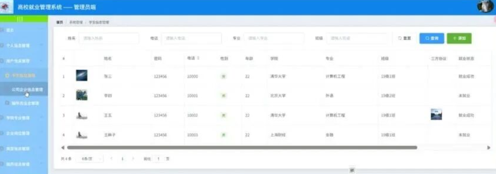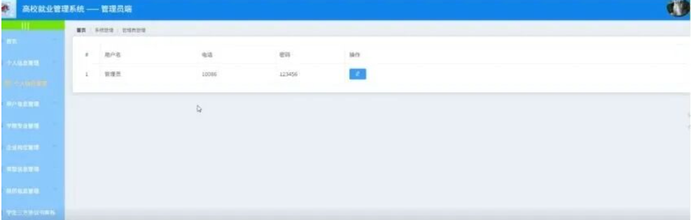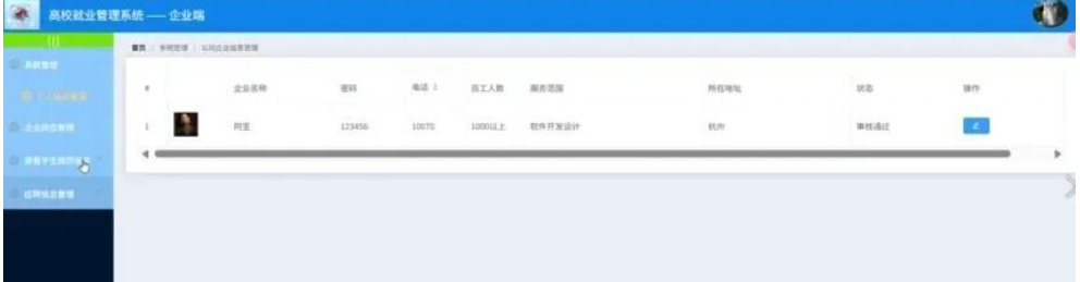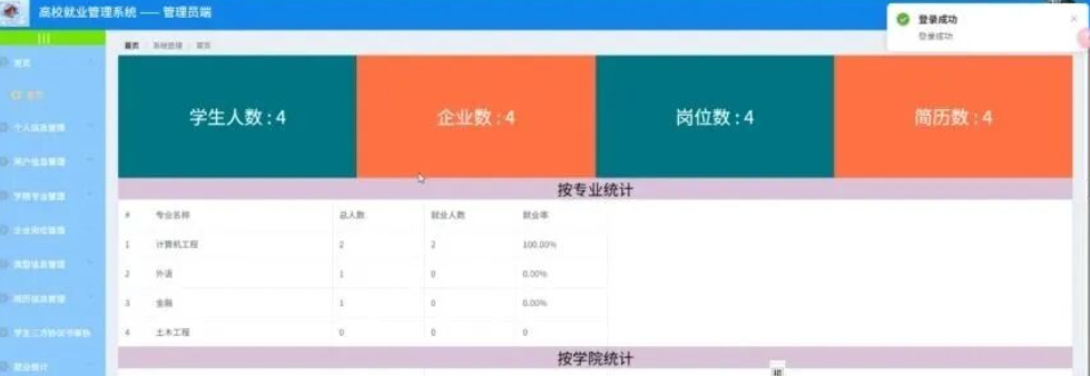 管理员点击就业统计;在就业统计页面对班级统计、学院统计、专业统计、企业统计(名称、总人数、就业人数、就业率)等信息进行查看或修改;