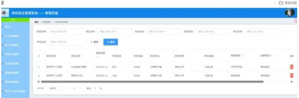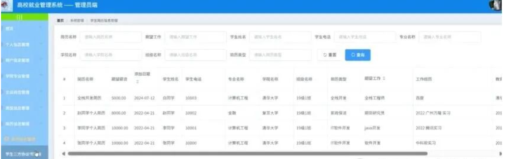 管理员点击学生三方协议管理;在学生三方协议管理页面对简历名称、岗位名称、添加日期、学生姓名、学生电话、所在专业、所在学院、所在班级、简历类型、应聘状态等信息进行查看或编辑、删除;