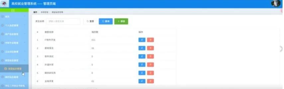 管理员点击类型信息管理;在类型信息管理页面对类型名称、简历数等信息进行查看、添加或删除;