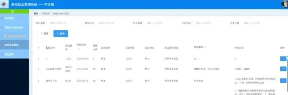 学生点击企业岗位信息;在企业岗位信息页面对岗位名称、岗位薪资、添加日期、需要人数、企业名称、企业电话、企业地址、企业劳务范围、岗位要求、岗位介绍等信息进行查看;。