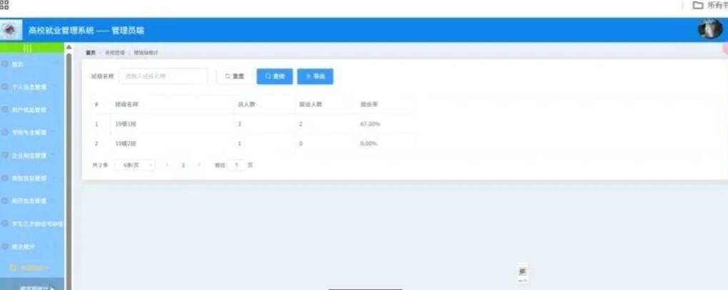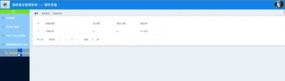 辅导员点击查看班级统计;在查看班级统计页面对班级名称、总人数、就业人数、就业率等信息进行查看;