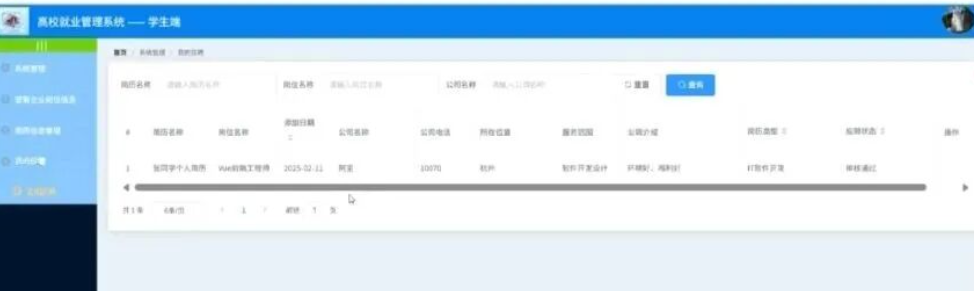 学生点击我的应聘;在我的应聘页面对简历名称、岗位名称、添加日期、学生姓名、学生电话、所在专业、所在学院、所在班级、简历类型、应聘状态等信息进行查看。