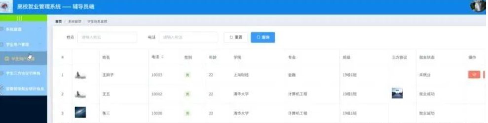 辅导员点击学生用户管理;在学生用户管理页面对姓名、电话、性别、年龄、学院、专业、班级、三方协议、状态等信息进行查看或修改;。