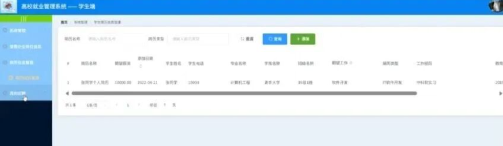 学生点击简历信息管理;在简历信息管理页面对简历名称、期望薪资、添加日期、学生姓名、学生电话、专业名称、学院名称、班级名称、简历类型、期望工作、工作经历等信息进行查看或修改;。