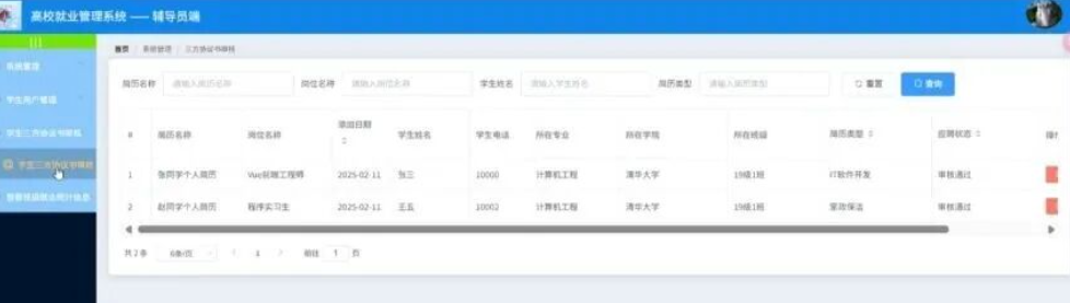辅导员点击学生三方协议审核;在学生三方协议审核页面对简历名称、岗位名称、添加日期、学生姓名、学生电话、所在专业、所在学院、所在班级、简历类型、应聘状态等信息进行查看或修改。