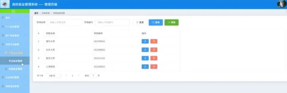 管理员点击学院专业管理;在学院专业管理页面对学院信息、专业信息、班级信息等信息进行查看或编辑;
