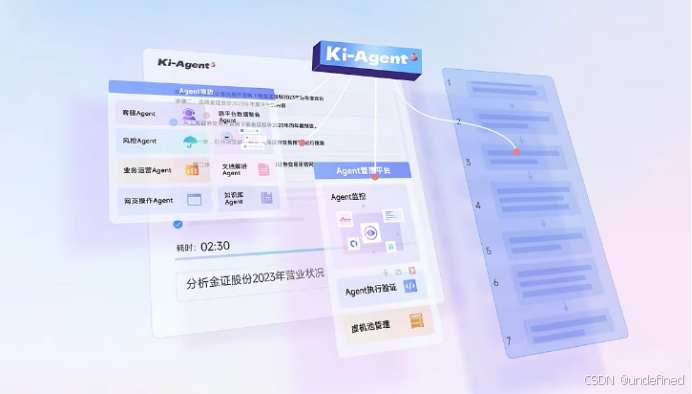 Ki-AgentS 智能体平台基于 Agentic AI 架构,具备认知与规划能力,可理解业务目标、分解任务路径,实现目标驱动执行,同时支持将 RPA 导入为 Agent,自主组织多个智能体协作,形成企业内部"数字员工"团队。