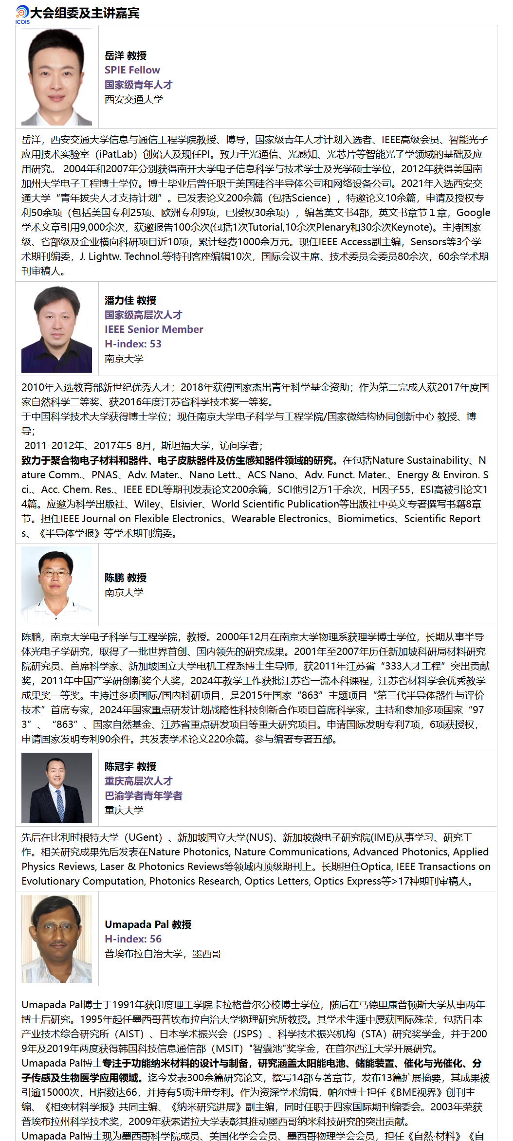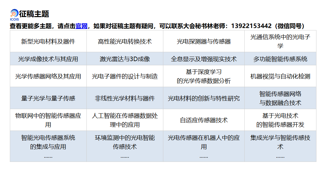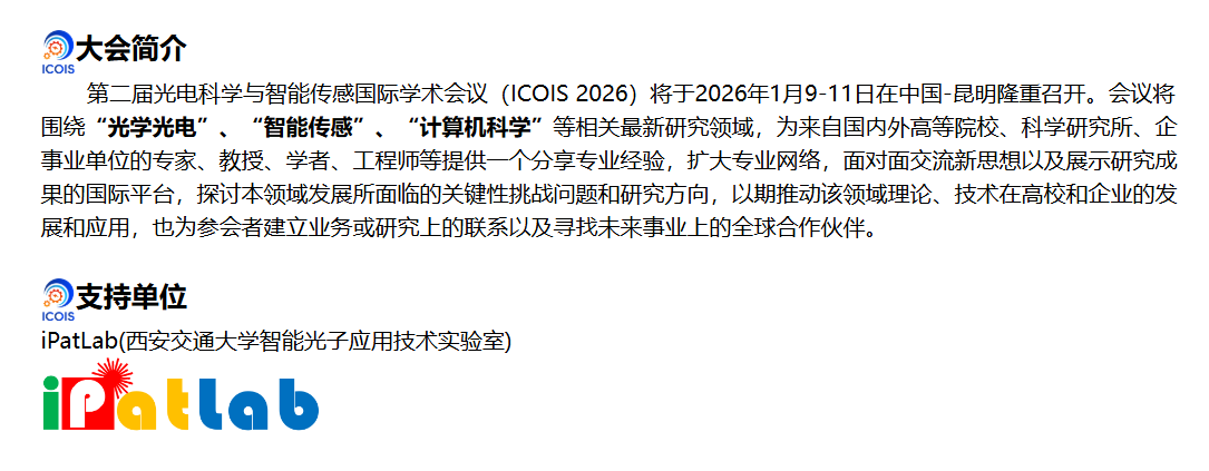 光电科学与智能传感是融合光学、电子学、材料科学、人工智能等多学科的交叉领域,其核心是通过光 - 电信号的转换与智能处理,实现对物理量、化学量、生物量等的高精度感知与分析。在工业检测、环境监测、生物医疗、智能装备等领域具有不可替代的应用价值,也是 ICOIS 2026 重点关注的前沿研究方向之一。