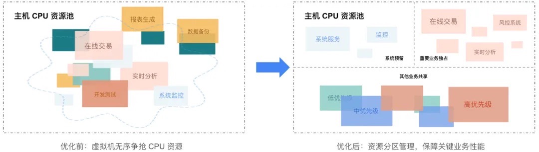 - **重要业务独占:**为核心交易系统设置 32 vCPU 独占,独占虚拟机不受其他虚拟机资源争抢影响,CPU 平均使用率可提升至 80%。
