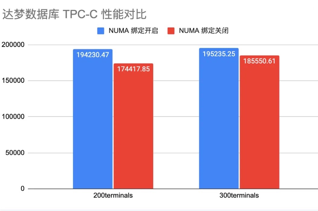 通过部署达梦数据库对内存访问速度进行测试,结果表明,启用 NUMA 亲和性调度后将带来 11 % 左右的性能提升。