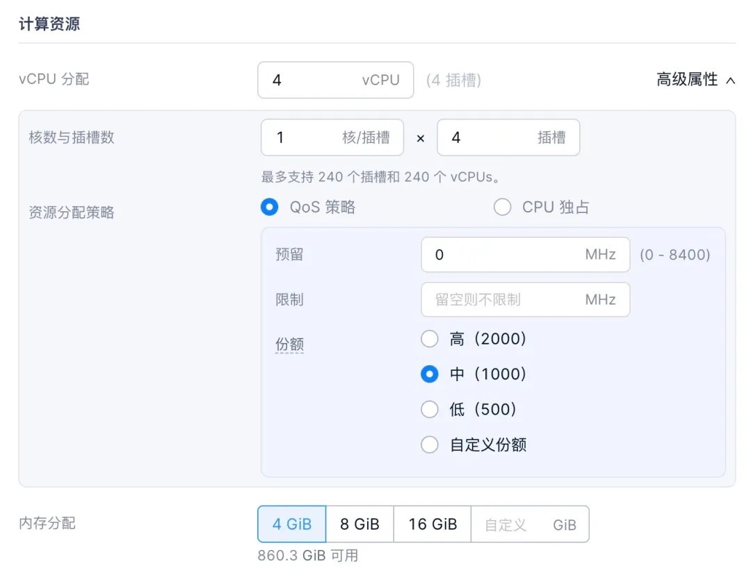 在实际运行中,承载重要或长期稳定业务的虚拟机需要能分配到稳定充足的 CPU 性能,以确保不会因资源争抢导致核心业务延迟甚至中断。CPU 份额的设置虽然保障了虚拟机分配到资源的优先级,但是有限的 CPU 资源和虚拟机数量的增加,将导致原有份额对应到的实际分配量降低,仍然可能发生虚拟机分配到的 CPU 资源无法满足虚拟机运行需要的情况。