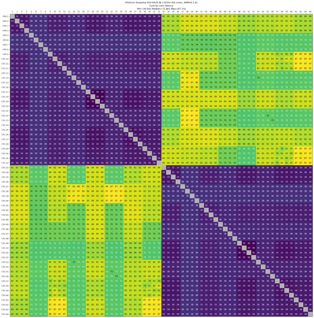 HiSilicon Kunpeng 920-6426 64 核 CPU 各核心访问延迟测试结果