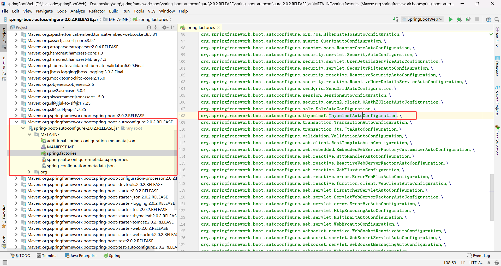 springBoot启动的时候会自动配置 org.springframework.boot.autoconfigure.thymeleaf.ThymeleafAutoConfiguration,即 Thymeleaf 的自动配置核心类