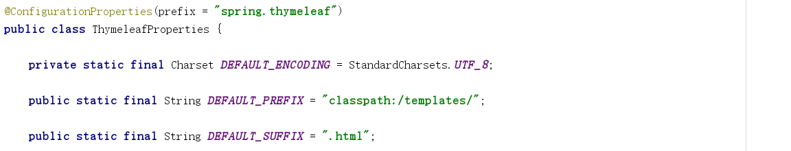 从 ThymeleafAutoConfiguration 的源代码中我们可以得知 ThymeleafProperties