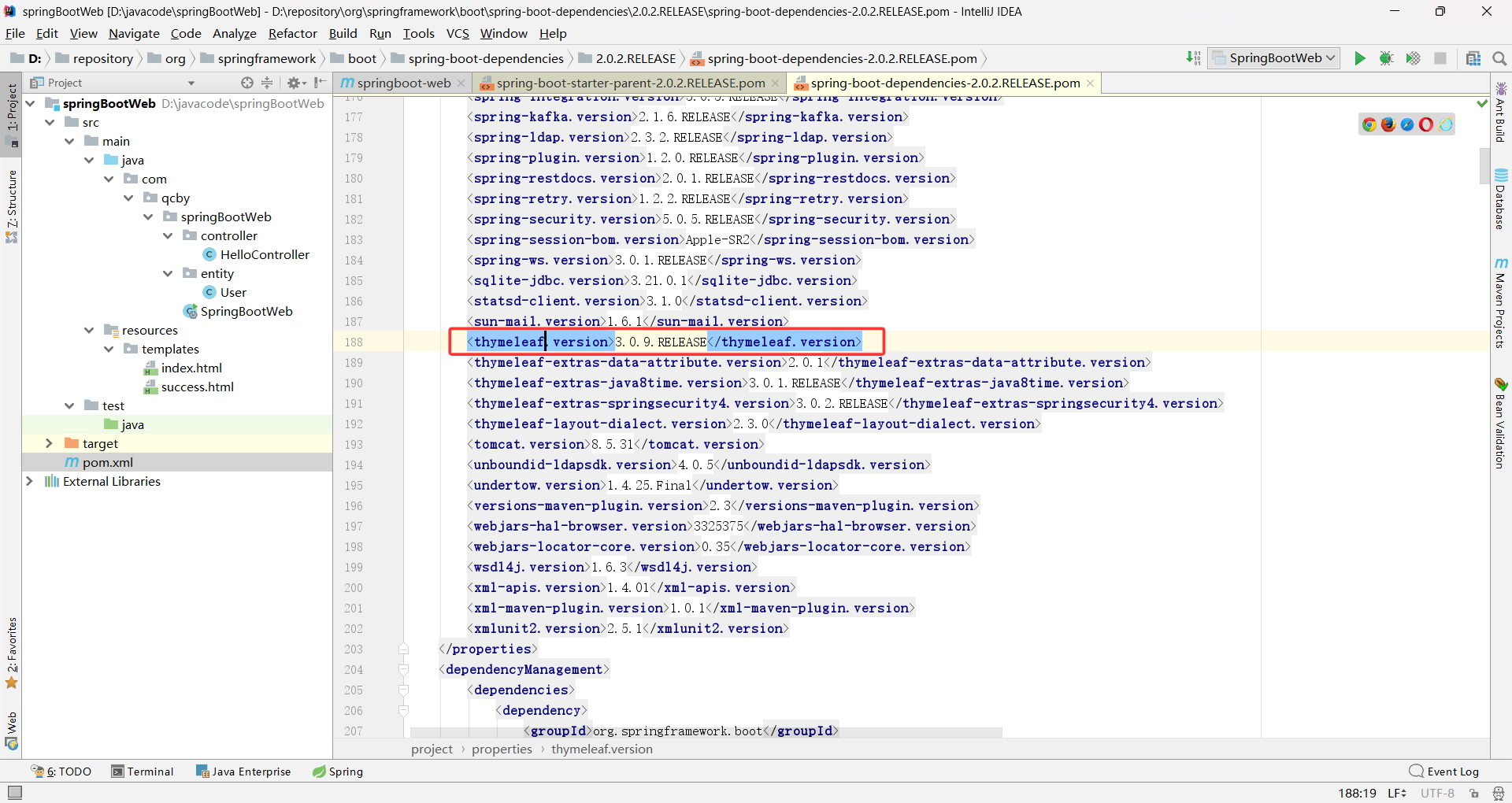 从 spring-boot 父文件中能看到 Springboot2.0.2.RELEASE 版本所使用的 thymeleaf 版本是 3.0.9.RELEASE,查找方法在我前面的这篇博客里 springboot的依赖管理机制