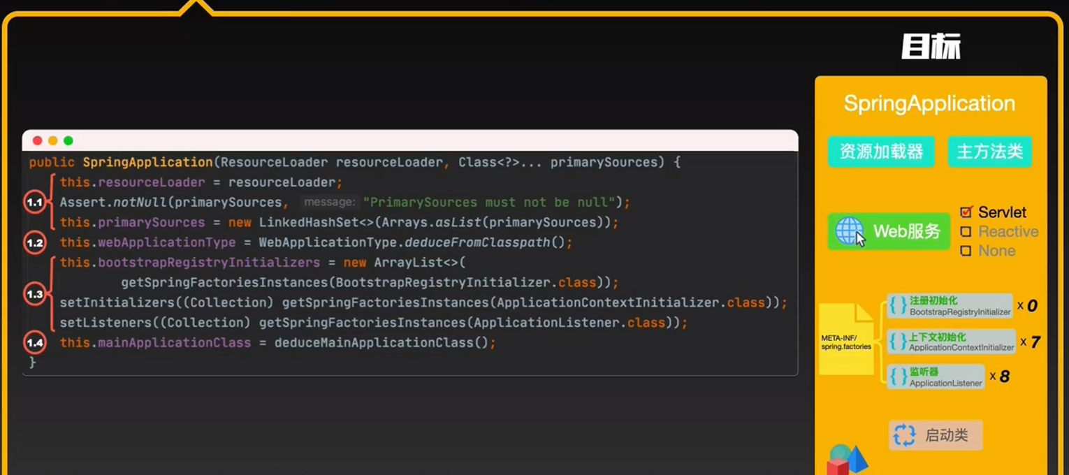 2.调用SpringApplication的构造方法,实例一个Spring应用对象,在构造方法里主要完成启动环境初始化工作,如,推断主类,spring应用类型,加载配置文件,读取spring.factories文件等
