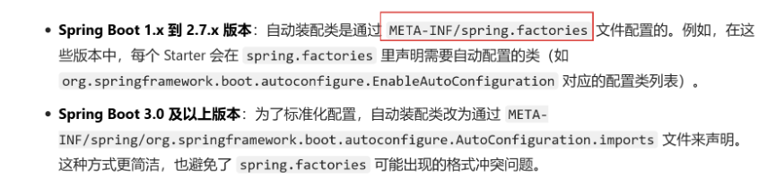 - @EnableAutoConfiguration借助@Import的帮助,根据项目引入的 jar 依赖,筛选 Spring Boot 内置的自动配置类,把框架预设的功能型 Bean(如 Tomcat、数据源、MVC 核心组件)加载到 IoC 容器,实现 "有什么依赖就自动配什么功能"的自动化配置核心注解
