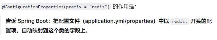 ⑤用户的端口和主机地址需要用户自己指定(配置文件中),不应该写死,所以我们创佳RedisProperties 类的代码。这是一个简化版的 Redis 配置属性类:
