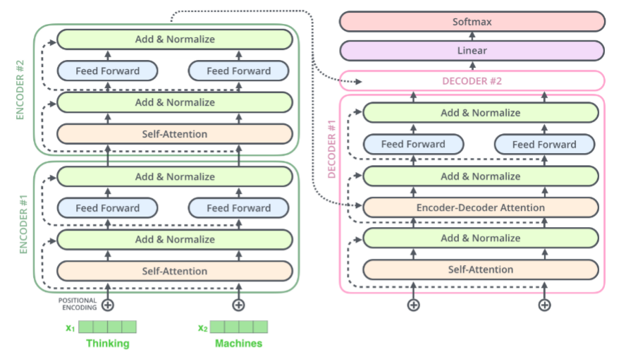 当模型处理每个单词(输入序列中的每个位置)时,自我注意允许它查看输入序列中的其他位置,以寻找有助于对该单词进行更好编码的线索。As the model processes each word (each position in the input sequence), self attention allows it to look at other positions in the input sequence for clues that can help lead to a better encoding for this word.
