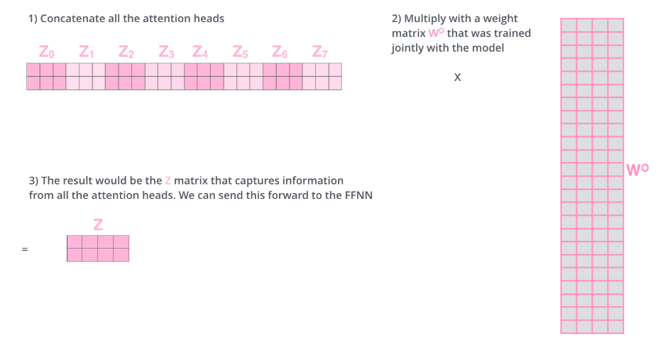 我们拼接这些矩阵,然后将它们乘以一个附加权重矩阵。