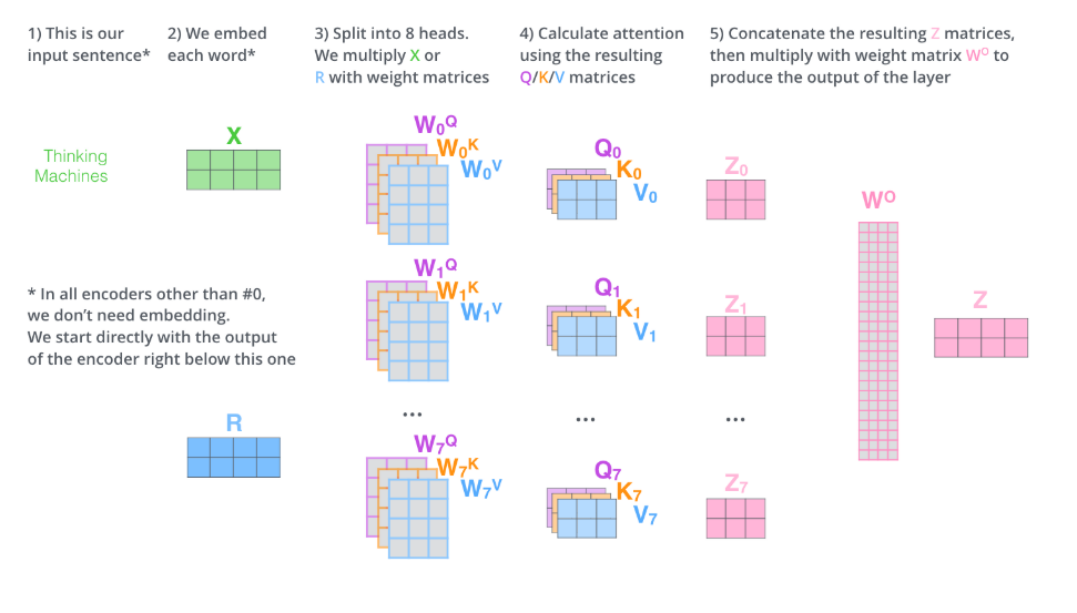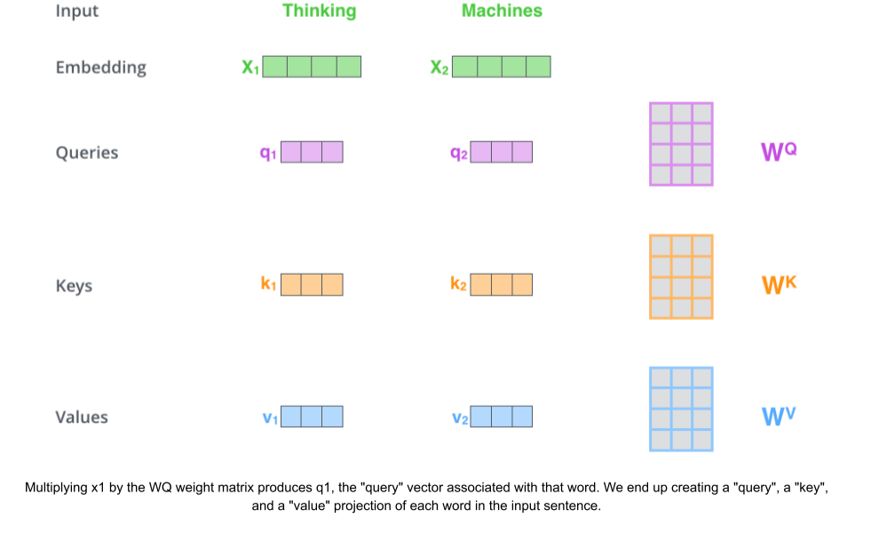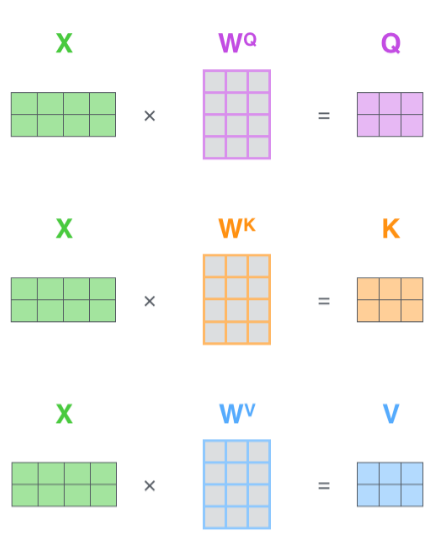 将我们的嵌入打包到一个矩阵X中,并将其乘以我们训练过的权重矩阵(WQ,WK,WV)。