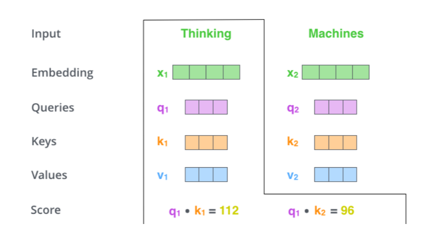 假设我们计算的是本例中第一个单词"思考"的自我注意力。我们需要对输入句子中的每个单词与该单词进行评分。分数决定了当我们在某个位置编码一个单词时,在输入句子的其他部分上的关注度。how much focus to place