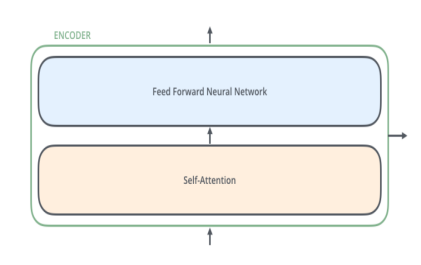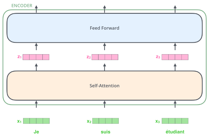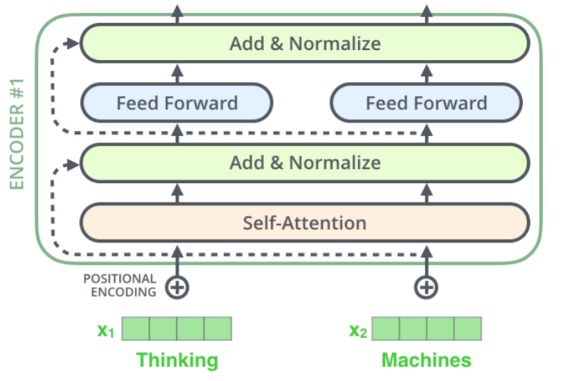在这里,我们开始看到Transformer的一个关键属性,即每个位置的单词在编码器中流经其自己的路径the word in each position flows through its own path in the encoder。在自我关注层,这些路径之间存在依赖关系。然而,前馈层不具有这些依赖性,因此各种路径可以在流经前馈层时并行执行。