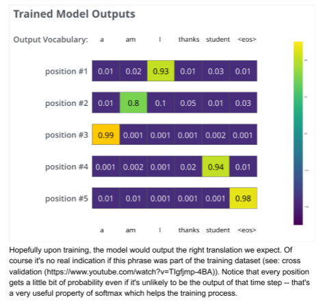 Softmax层然后将这些分数转换为概率(全部为正,全部相加为1.0)turns those scores into probabilities。选择概率最高的单元格,并生成与其相关联的单词作为该时间步长的输出。