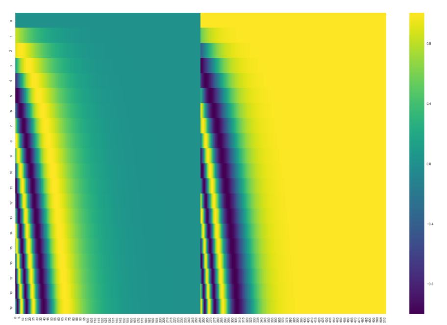 你可以看到它似乎沿着中心一分为二。这是因为左半部分的值是使用sin生成的,而右半部分是由使用cos生成的。然后将它们连接起来,形成每个位置编码向量。