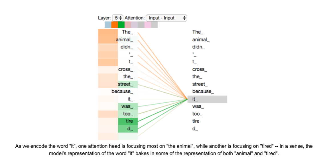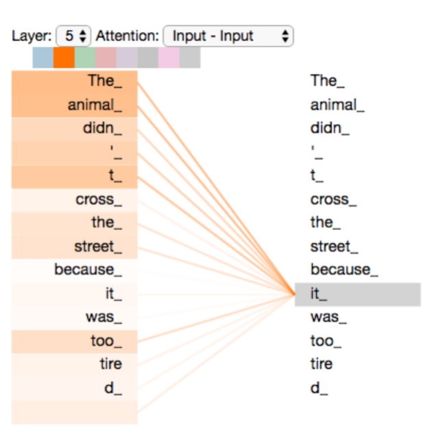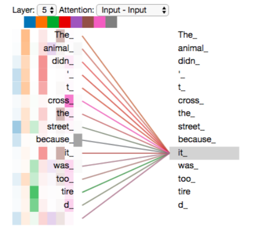 回到之前关于it应该注意"The animal didn't cross the street because it was too tired."的哪些部分,可以看到第一列animal(it指代的对象)颜色较深,第二列tire(it的状态)颜色较深