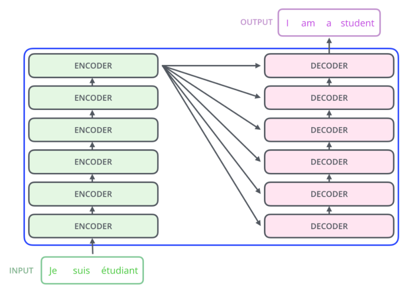 先把整句输入送进左边那一摞 Encoder(通常 6 层),让它们逐层提炼特征。