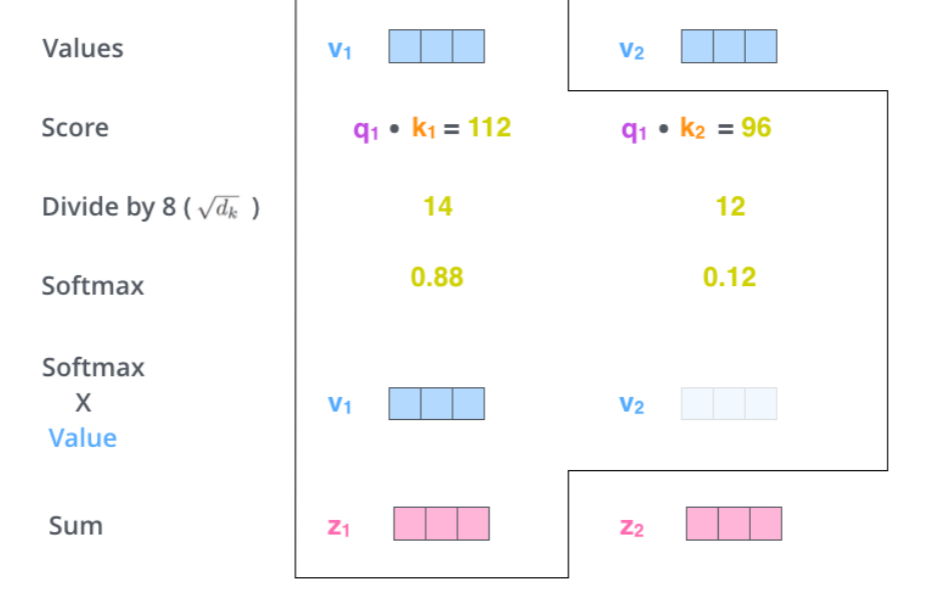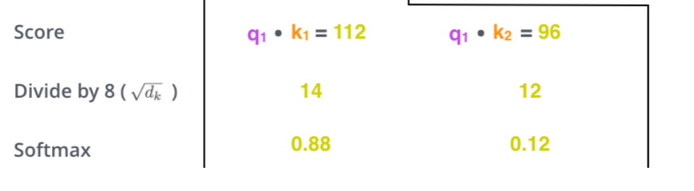 因此,如果我们处理的是位置为1的单词的自我注意,第一个分数将是Q1和K1的点积。第二个分数是Q1和K2的点积。