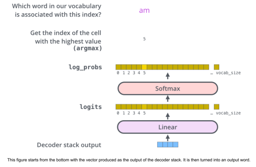让我们假设我们的模型知道10,000个唯一的英语单词(我们的模型的"输出词汇"),它是从它的训练数据集中学习的。这将使Logits向量有10,000个单元格宽--每个单元格对应一个唯一单词的分数。这就是我们如何解释模型的输出,然后是线性层。