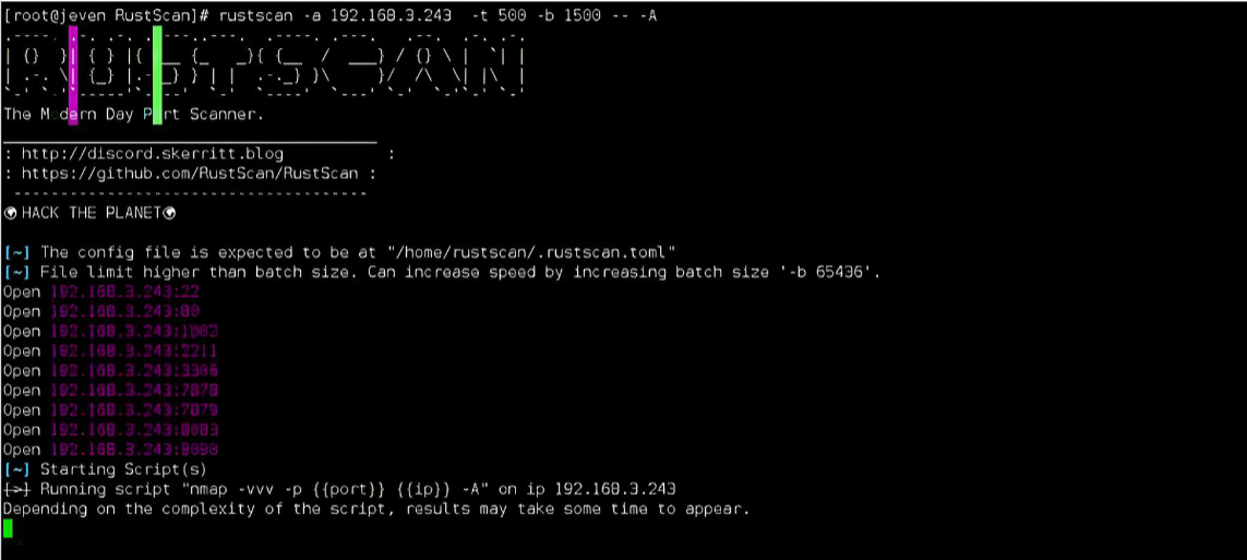 Rustscan是基于Rust语言开发的高速端口扫描器,能在短时间内扫描大量的端口。同时支持结果导入Nmap。因为基于Rust,所有它的优势以快速、智能、有效而闻名。
