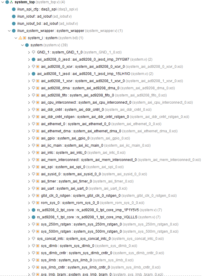 双ADC接口核:axi_adc_core 有两个实例(rx_0_adc, rx_1_adc),分别对应两个物理ADC芯片的数据流。