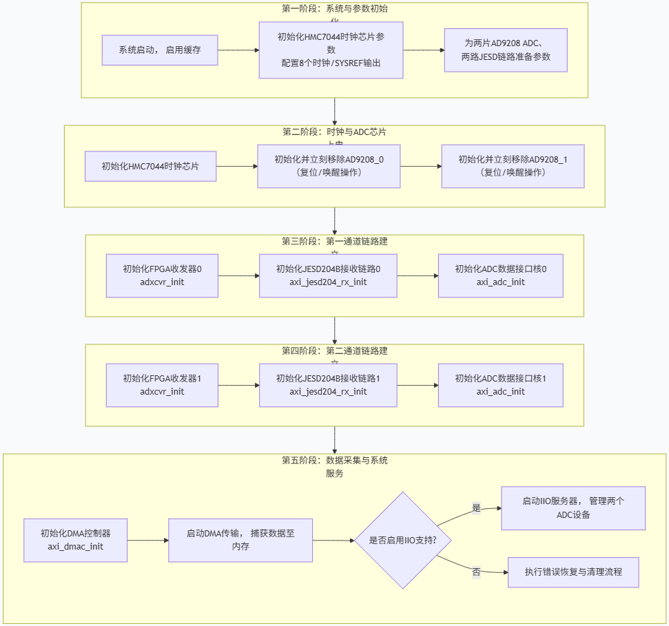 2、初始化双ADC:执行特定的上电序列来启动两片高速ADC。