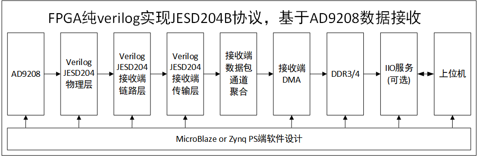 本设计使用Xilinx系列FPGA为平台,基于纯verilog实现的JESD204B协议实现AD9208数据收发,旨在为读者提供一套精简版的、基于JESD204B协议的的数据收发架构;