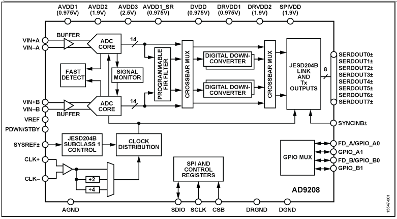 AD9208双通道 ADC 内核采用具有集成式输出纠错逻辑的多级差分流水线架构。每个 ADC 都配备了宽泛的带宽输入,支持各种用户可选的输入范围。集成基准电压源简化了设计考虑事项。模拟输入和时钟信号是差分输入。ADC 数据输出通过交叉复用器从内部连接到四个数字下变频器 (DDC)。每个 DDC 包括多达五个级联信号处理级:48 位变频器(数控振荡器 (NCO)),以及多达四个半带抽取滤波器。NCO 允许在通用输入/输出 (GPIO) 引脚上选择预置频段(最多可以选择三个频段)。通过 SPI 可编程配置文件,可以在多个 DDC 模式之间选择 AD9208 的操作。