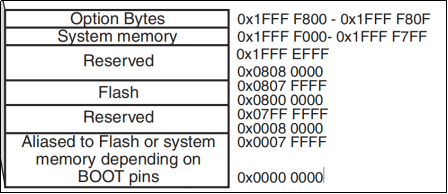 0x0000 0000-0x0007 FFFF:取决于BOOT引脚,为 FLASH还是系统存储器还是SRAM 的别名。(512K)