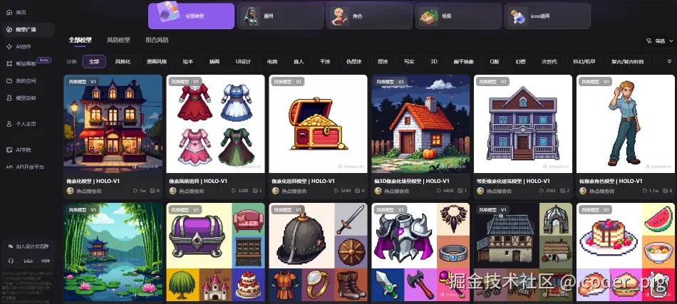 😀 既然是想 "复刻 ",那 "美术风格 " 妥妥得搞成 "GBA像素风 ",Holopix AI 提供了大量不同风格的 "预设模型 ",随手搜了下 "像素 ",都有 20+ 种: