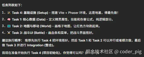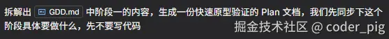 🤔 接着,直接让 Trae 按照这个 GDD 文档来干活吗?可以,但我倾向于再 "拆 ",先做 "可行性的快速验证 ",而不是直接一股脑干到头,这样省 Token ,效率更佳 ,有不对的可以 快速调整: