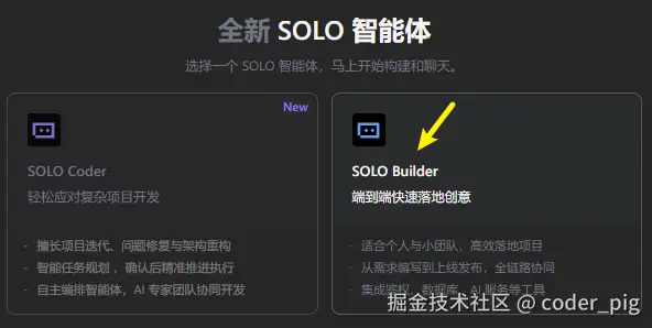 上节重构两项目用的 Agent 是 SOLO Coder ,这节是 "创意快速落地 ",所以用 SOLO Builder: