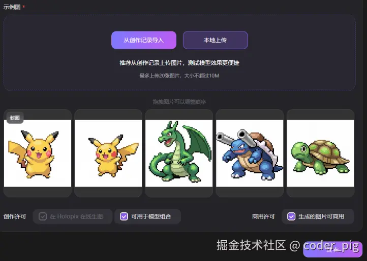 做下填空,然后 示例图 直接选 "从创作记录导入",选几张还凑合的,点击发布,然后别人就能搜到你的模型了: