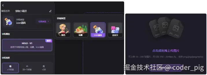 训练类型选 "icon道具 ",训练强度选 "低 ",然后点击 上传图片:
