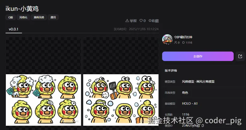 😃 不过,杰哥想更加 "原汁原味 ",Holopix AI ****是支持 "模型定制 " 的,还记得上节 "坤坤自走棋 ",我们用网上搜罗到的 "ikun小黄鸡 " 图片作为素材,训练了一个专用用来生成小黄鸡的 "ikun" 模型吗?