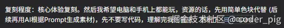让我们确认几个 "立项目标 "-复刻程度、技术栈选择、美术与资源,简单做下 "填空题 ",Prompt 后面同样要加上 "先不要写代码,理解完需求,更新GDD文档":