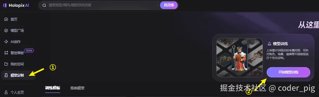 打开 Holopix AI 官网,点击左侧 "模型定制 " → "开始模型训练":