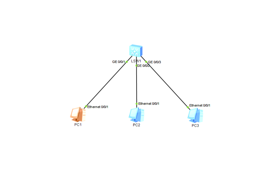 创建如图所示的网络拓扑结构,共使用到1台交换机和3台PC。